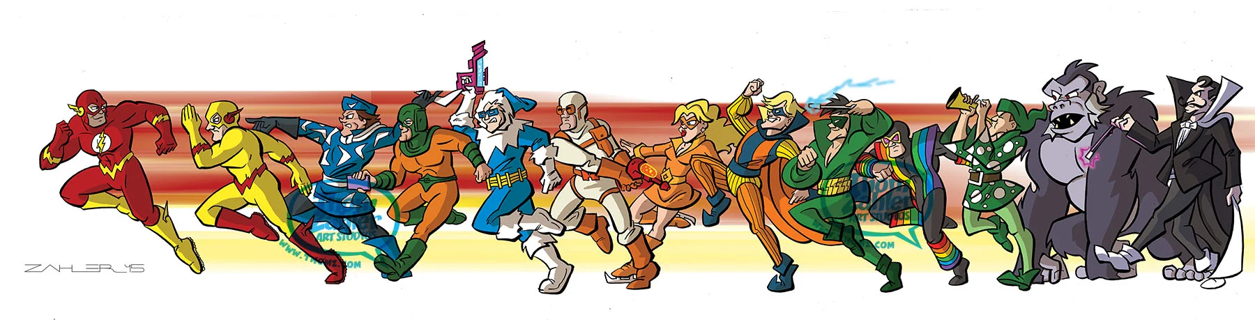 Every year I participate in the C2E2 charity auction benefitting St. Jude's. I've drawn Ponies as Cubs and White Soxs, donated pages and more. This year, I decided to do something like my Doctors Who piece featuring the Flash and his many villains. The Flash is one of my favorite TV shows this season, and Flash himself has maybe the third best Rogues' Gallery. (Spider-Man and Batman come ahead, in my opinion.) I decided to do the 80's version of the bad guys, so you won't see the Top (he was dead at the time), Turtle Man (barely used at that point) and Mr. Element/Dr. Alchemy (who had reformed).